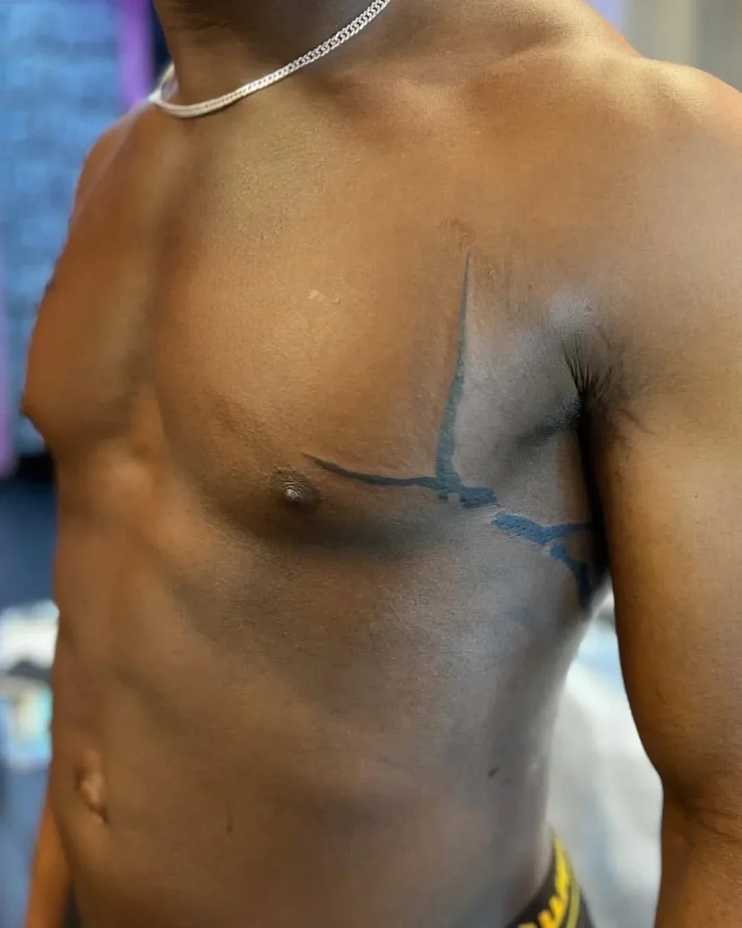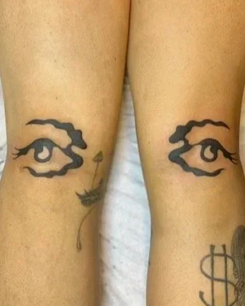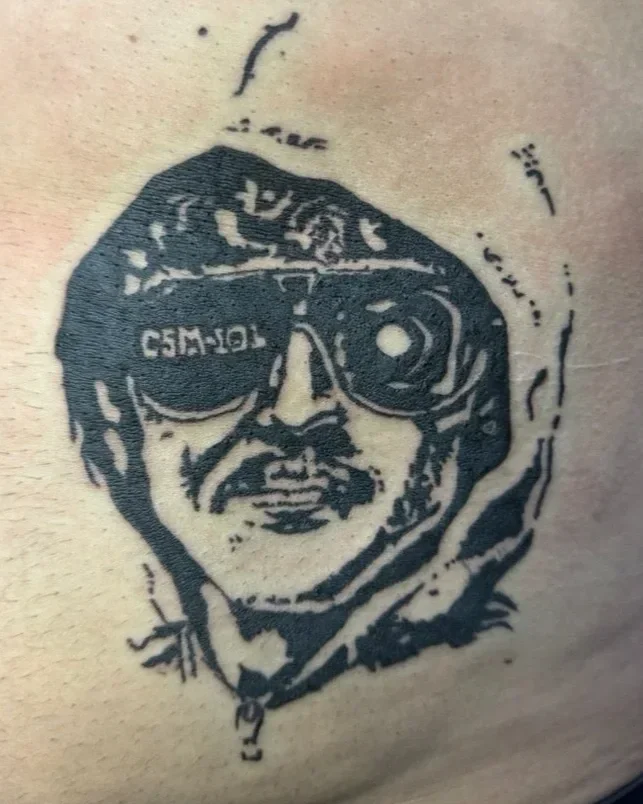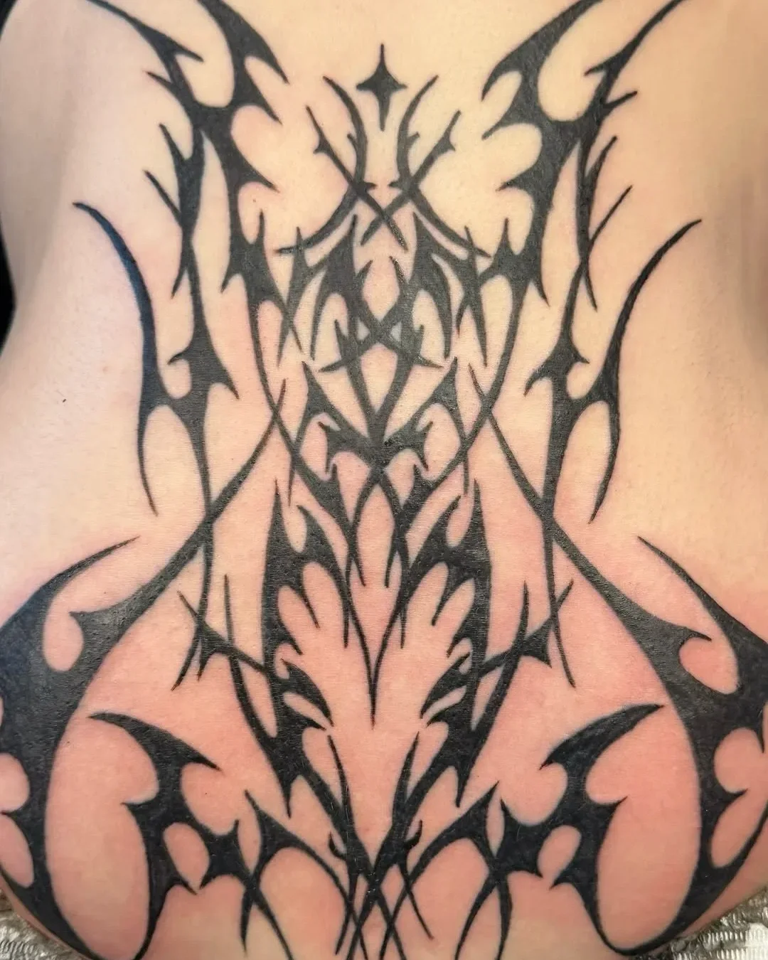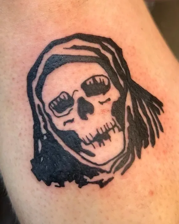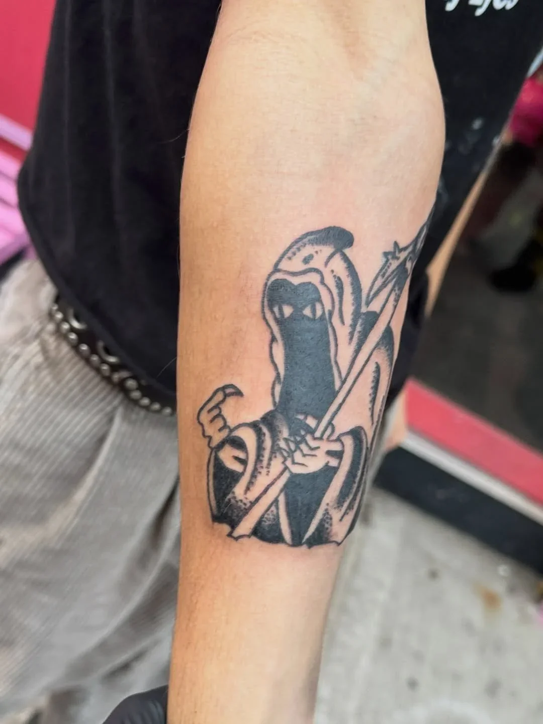 Roach works primarily in bold blackwork and traditional. Their style embraces rough textures, heavy contrast, and imagery that leans dark and surreal.